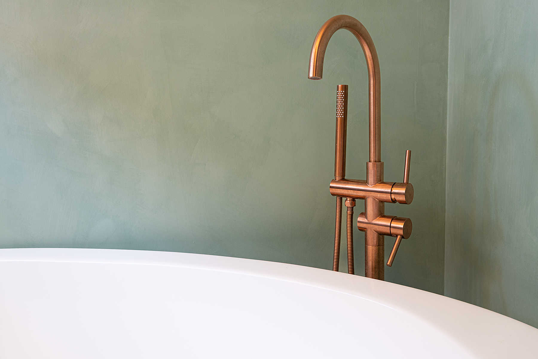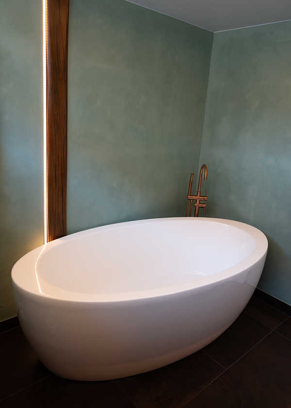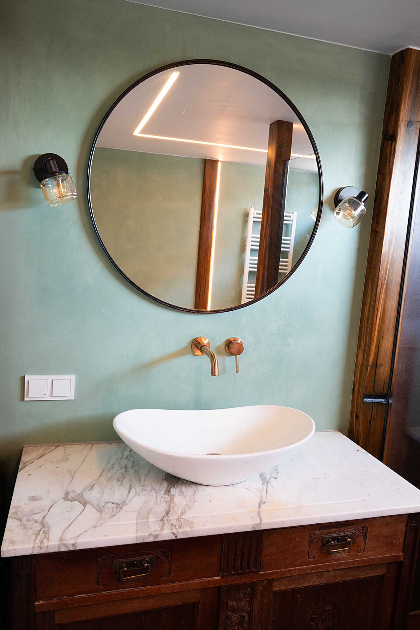Deze badkamer straalt warmte en luxe uit door de combinatie van natuurlijke materialen en moderne accenten. De houten onderkast met marmeren blad en organische waskom vormt een stijlvol geheel. De koperkleurige wandkraan en zachtgroene betonlook-wand zorgen voor een verfijnde, rustgevende sfeer. De ronde spiegel en industriële wandlampen maken het plaatje compleet. Een perfecte balans tussen klassiek en modern!Â